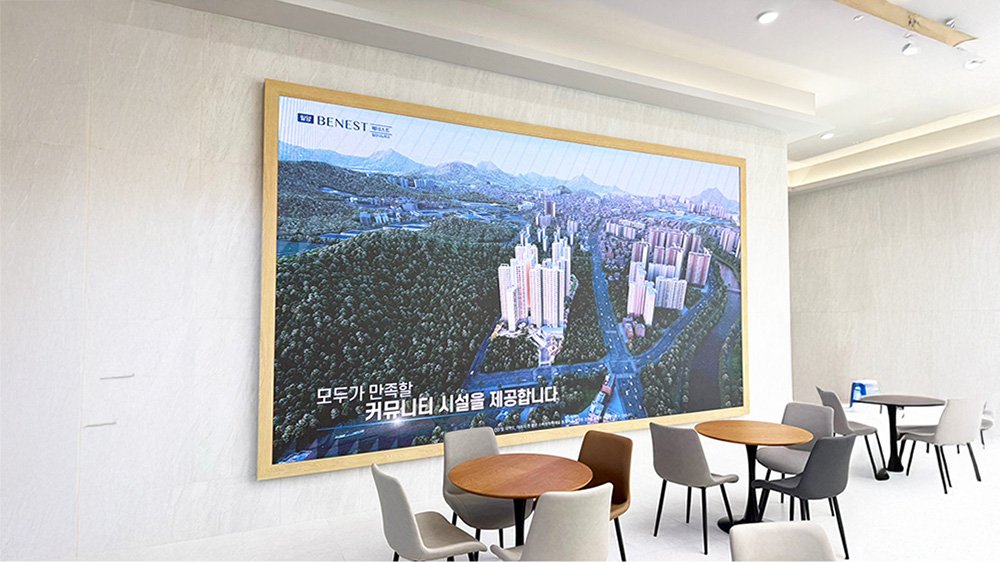 마감 처리에도 세심한 배려를 더했습니다. 우드 프레임으로 LED를 감싸 대형 액자나 창문처럼 느껴지도록 디자인하여, 공간에 답답함은 줄이고 세련된 전시 효과를 극대화했습니다.